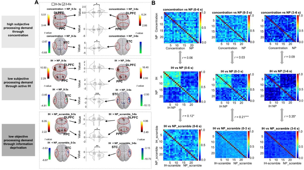 实验三(fMRI):通过对比主动抑制、主动专注以及被动信息剥夺(如听取杂乱音频、闭眼)三种状态,检验所发现的神经动态模式的特异性与普遍性。