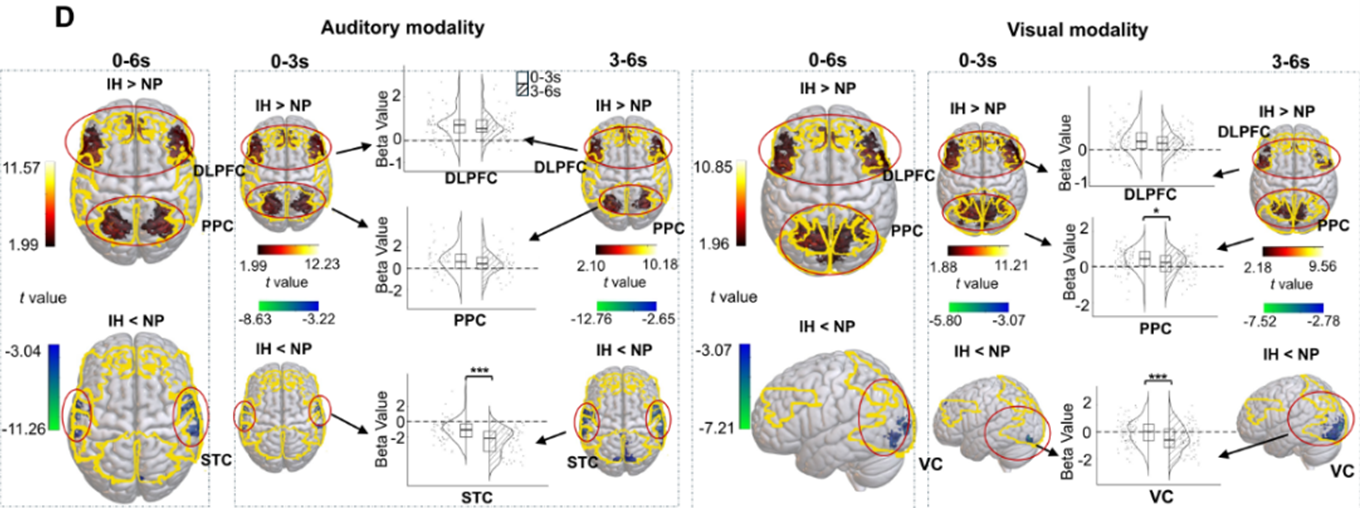 研究发现,直接抑制与竞争性抑制共享一个“以失活为主导”的时间动态模式。①“先激活,后失活”的动态特征:在抑制的早期阶段(约0-3秒),额顶叶控制网络(DLPFC/PPC)被激活;而在后期阶段(约3-6秒),该网络的激活水平逐渐下降,同时感觉皮层(听觉/视觉皮层)的失活水平则进行性加深。抑制行为表现越好,感觉皮层的这种动态失活就越显著。
