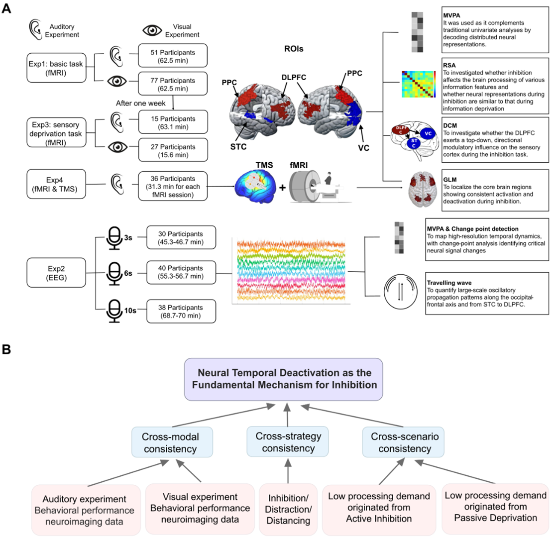 本研究通过四个环环相扣的实验,对272名健康成年人的数据进行了分析。实验一(fMRI):采用功能磁共振成像技术,设计了平行的听觉与视觉抑制任务,并使用共同激活分析(Conjunction Analysis)来识别不同抑制策略(直接抑制、分心、抽离)在跨感觉模态下的共同神经基础。
