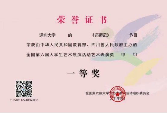 由中华人民共和国教育部、四川省政府共同主办的全国第六届大学生艺术展演活动于2021年5月6日-13日在成都市举办。芒果体育戏剧作品《还狮记》获得艺术表演类甲组一等奖、优秀创作奖,展示了芒果体育艺术教育的高水平、高质量。